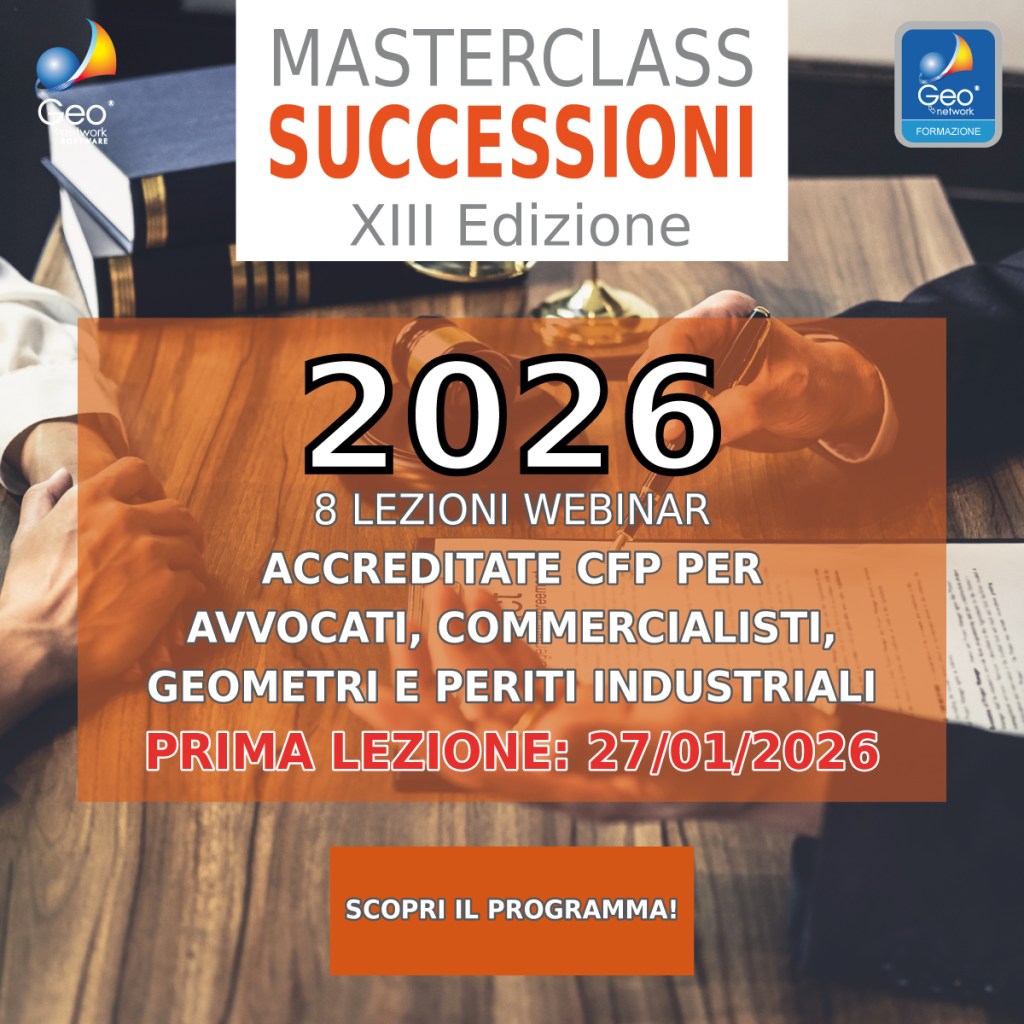 Altre novità riguardanti le dichiarazioni sostitutive, controlli da parte dell’Agenzia, termini, sanzioni, agevolazioni e riduzioni fruibili nonché la disciplina fiscale dei trusts istituiti per testamento, saranno oggetto di ulteriore studio con l’ausilio di esperti durante apposite lezioni (accreditate CFP) nell’ambito del corso specialistico Masterclass Successioni 2025 (vedi: https://www.geonetwork.it/formazione).