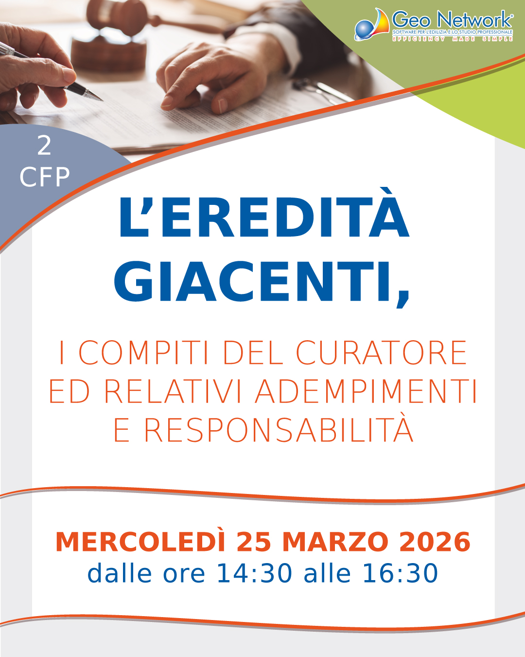 La prossima lezione di Masterclass Successioni 2026 riguarderà le eredità giacenti, con un avvocato esperto in materia che tratterà i compiti del curatore, adempimenti fiscali e responsabilità. E’ possibile iscriversi su https://www.geonetwork.it.